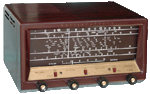 | This radio, an Airline, found in an old radio service shop in Nevada. When it arrived it was in very poor shape. The case was broken into four pieces and I had to fish though the packing materials to find all of the small parts that made up the dial and tuning assembly. The piece of bakelite that belonged between the second and third pushbutton was missing. However glue and bondo, purchased from a auto repair shop, saved the day and the radio. After reassembly and replacement of the filter capacitor it came to life. The only thing wrong with it is a very dim tuning eye. I'll replace it when I find one. | ![]() |